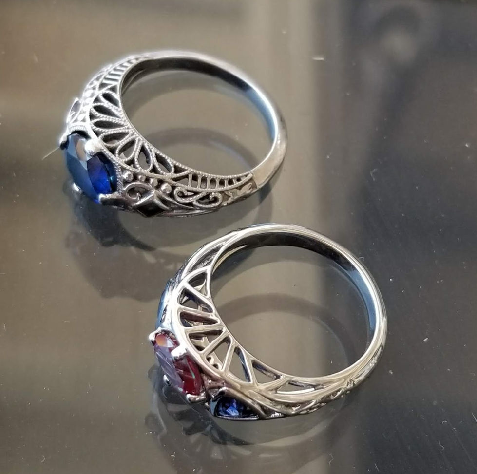 Both pieces were developed in CAD, with careful consideration of stone proportions, setting architecture, and metal choice. The engagement ring was fabricated in platinum to support intricate, flowing forms around a natural sapphire and natural alexandrites. The mother’s ring transitioned to 14k white gold with synthetic stones, using stronger symmetry, defined edges, and architectural geometry to reflect Art Deco influence.